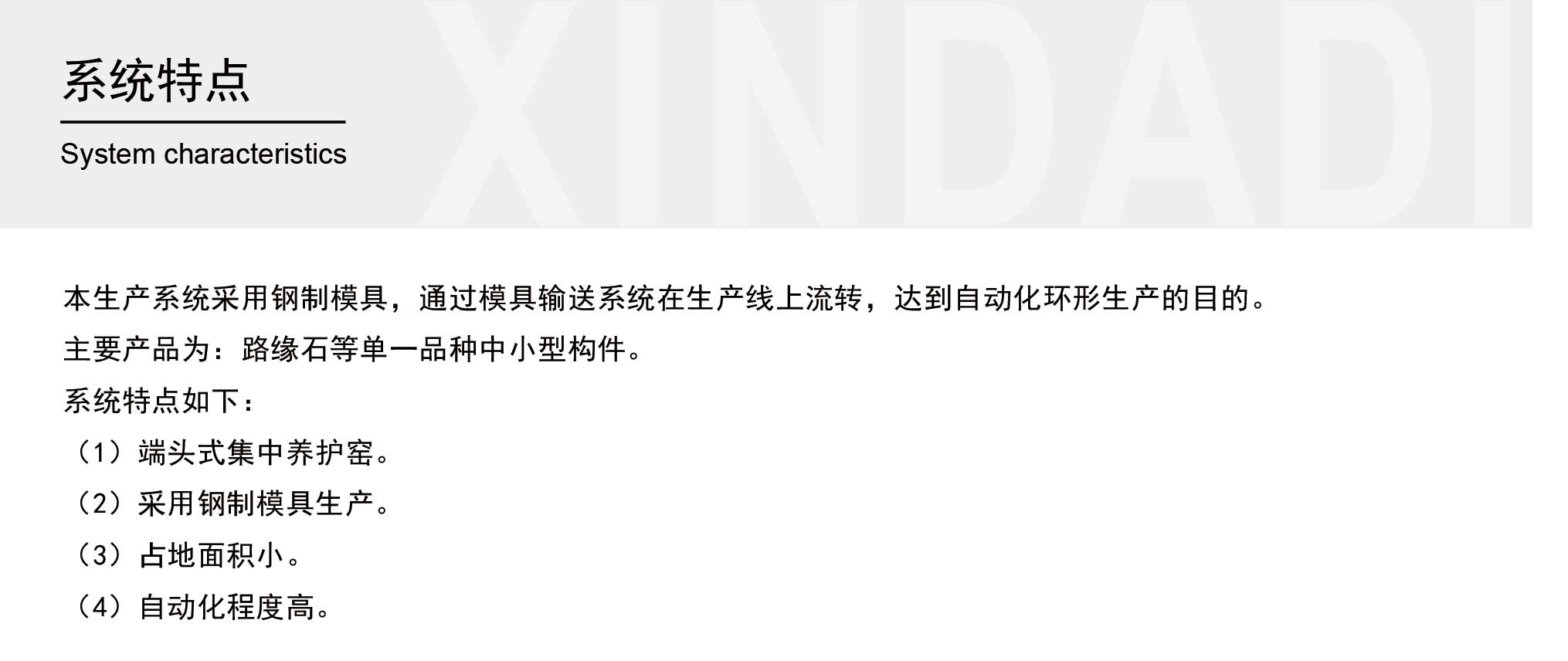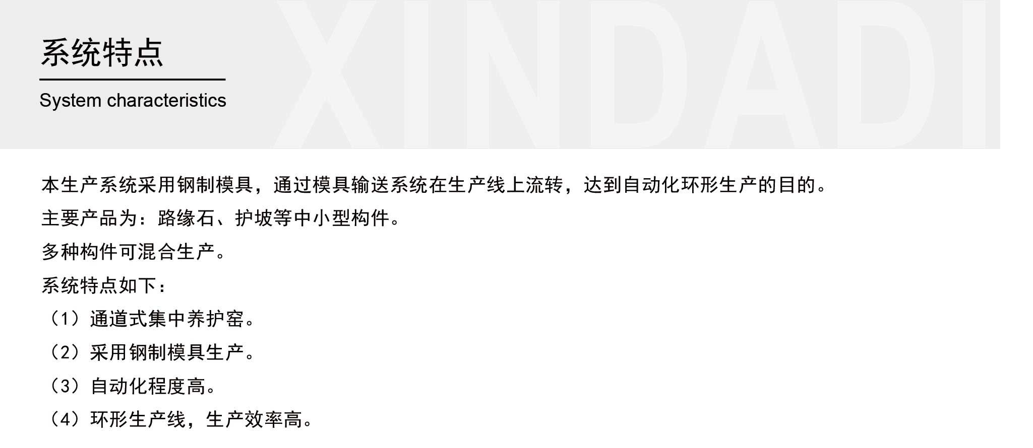 中小型預制構件生產系統(tǒng)主要產品為路緣石、護坡、蓋板、六角磚、欄片、遮板等中小型構件,多種構件可混合生產。