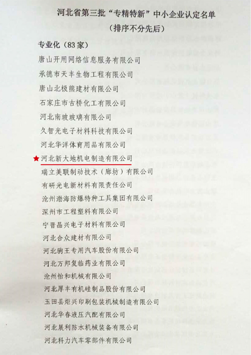 河北新大地機電制造有限公司 通過河北省第三批“專精特新”中小企業(yè)認(rèn)定