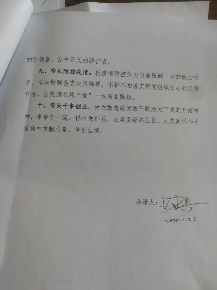 時(shí)間:2020-02-23 來源:“我承諾,帶頭做到不搞聚會(huì)、減少外出,帶頭宣傳防疫知識(shí)、抵制謠言散布,帶頭承擔(dān)急難險(xiǎn)重任務(wù)、聯(lián)系服務(wù)職工群眾,在企業(yè)疫情防控和復(fù)工復(fù)產(chǎn)中踐行好黨員的初心使命?!?/p>
