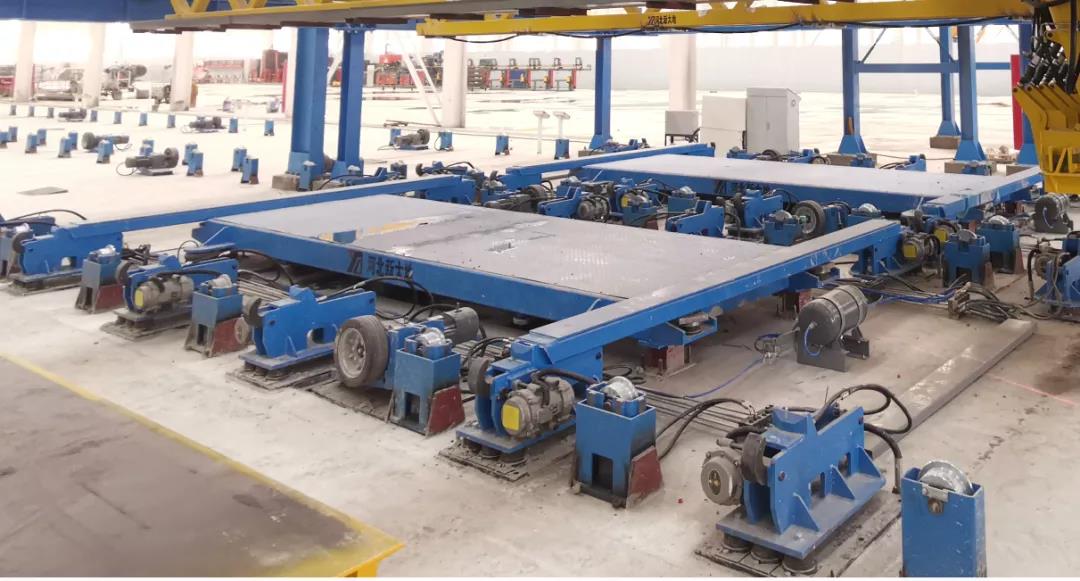 該項目設(shè)計為自動化綜合環(huán)形生產(chǎn)線,采用了滾輪支撐模臺輸送方式運行,魚雷罐采用容量3m3雙軌并行結(jié)構(gòu),同時搭配3m3螺旋布料機(jī)。養(yǎng)護(hù)窯采用兩座4列10層,雙進(jìn)雙出,層高600mm,雙挑門的結(jié)構(gòu),實現(xiàn)了對多品種高度構(gòu)件集中養(yǎng)護(hù),節(jié)能降耗。該生產(chǎn)線系統(tǒng)設(shè)計緊湊,工藝布局科學(xué)合理,安全性強,生產(chǎn)效率高、機(jī)械化程度高、成熟穩(wěn)定等特點,可適用于生產(chǎn)外墻板、內(nèi)墻板、疊合板等幾何形狀比較規(guī)范的批量大的構(gòu)件。