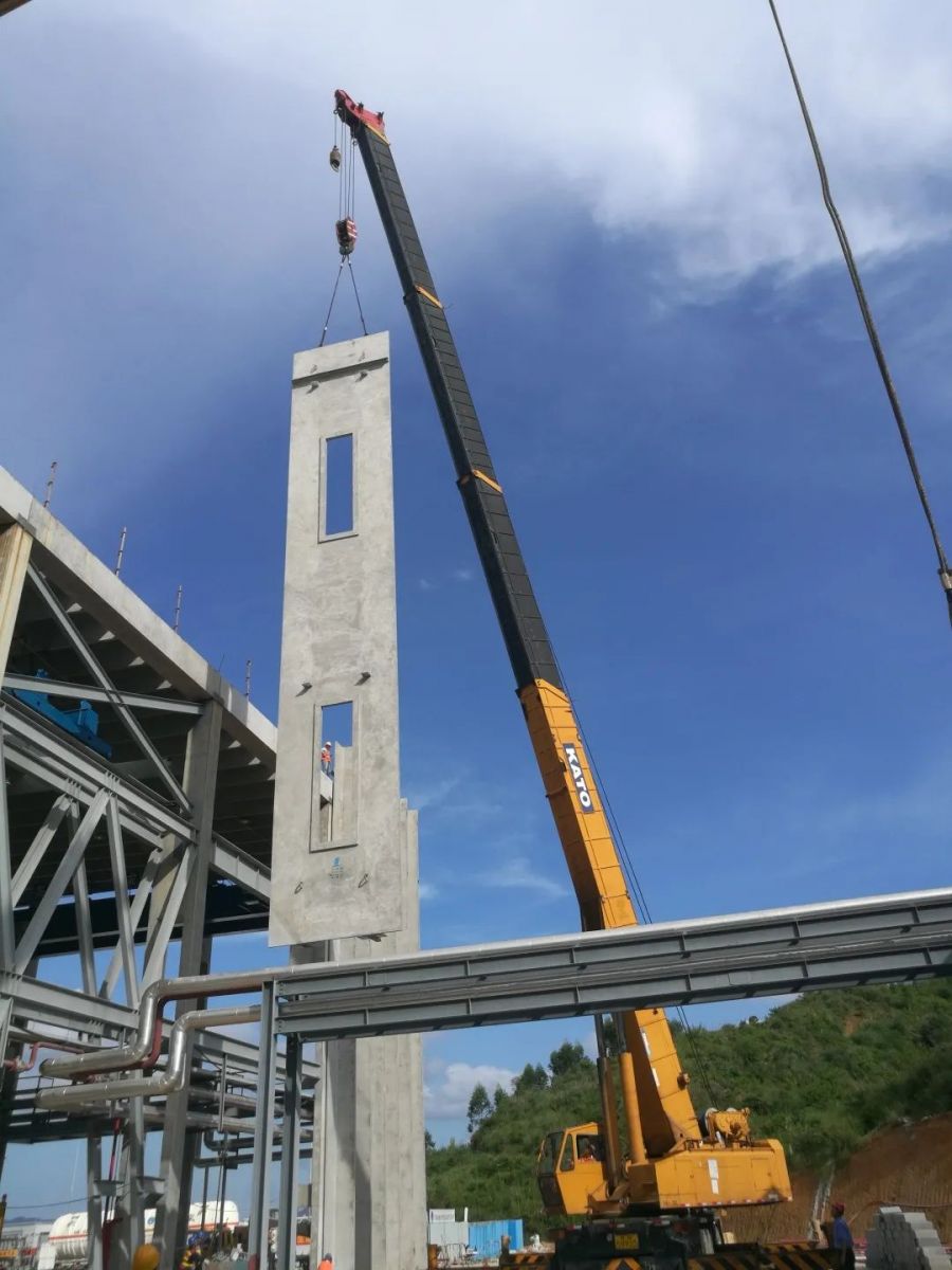 在園區(qū)建設(shè)過程中采用PC自建PC,廠房建設(shè)與生產(chǎn)線建設(shè)幾乎同步進(jìn)行,完美詮釋了設(shè)計—生產(chǎn)—施工一體化的模式。本項目PC廠房采用全預(yù)制混凝土構(gòu)件進(jìn)行建造,包括自制混凝土立柱、混凝土雙T墻板、混凝土雙T屋面板等;此外,項目還采用預(yù)應(yīng)力混凝土雙T墻板和屋面板構(gòu)建多層辦公樓。