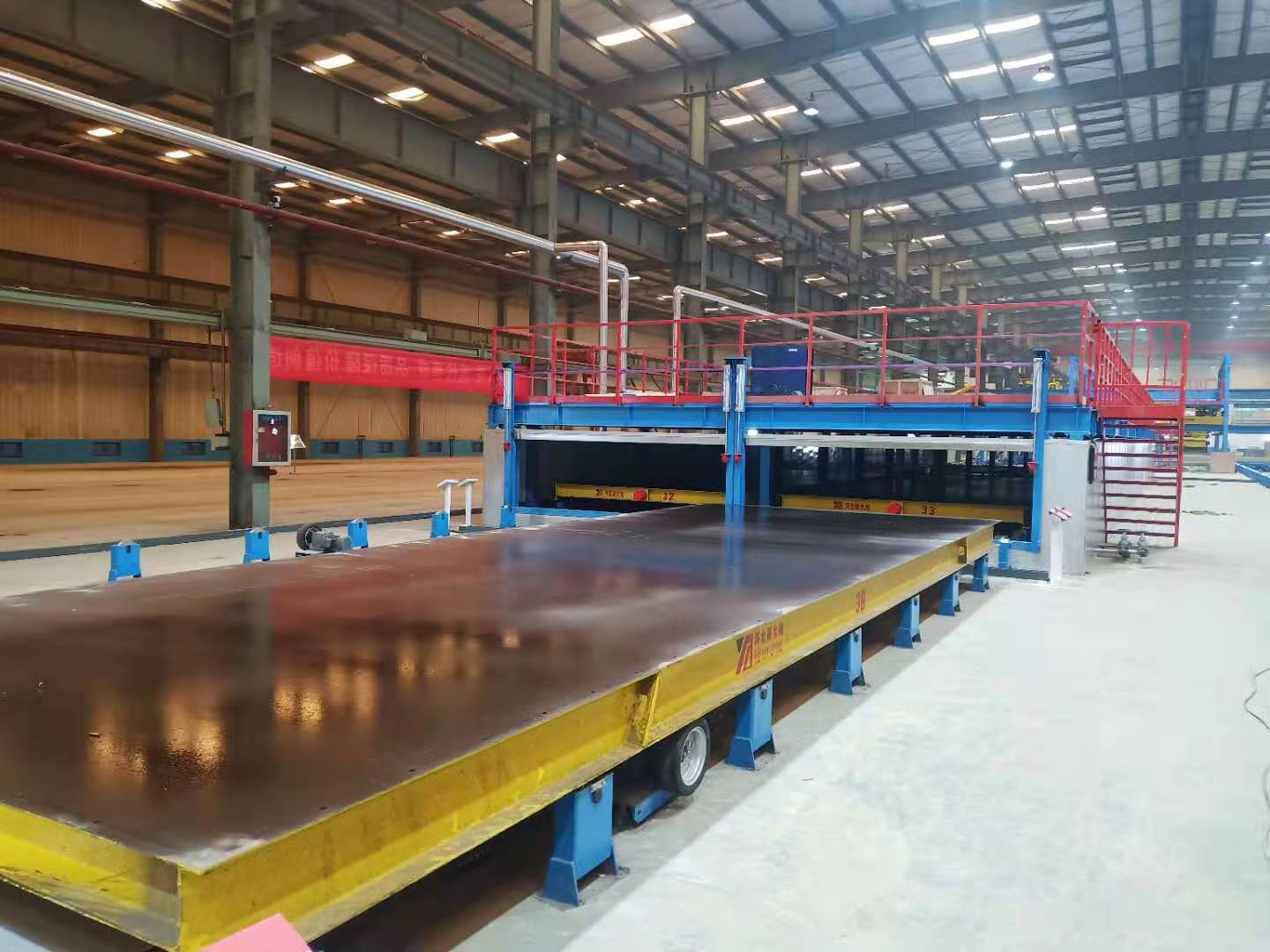 該項目根據(jù)原有舊廠房設計為自動化綜合環(huán)形生產(chǎn)線,采用了滾輪支撐模臺輸送方式運行,混凝土運輸料斗采用下開門形式,容量2m3環(huán)形運輸結(jié)構(gòu),配備2.5m3螺旋布料機及低噪音三維振搗臺。養(yǎng)護窯采用兩座4列6層,配備地軌碼垛機穩(wěn)定可靠,實現(xiàn)了對多品種高度構(gòu)件集中養(yǎng)護,節(jié)能降耗。該生產(chǎn)線系統(tǒng)設計緊湊,工藝布局科學合理,安全性強,生產(chǎn)效率高、機械化程度高、成熟穩(wěn)定等特點,可適用于生產(chǎn)外墻板、內(nèi)墻板、疊合板等幾何形狀比較規(guī)范的批量大的構(gòu)件。